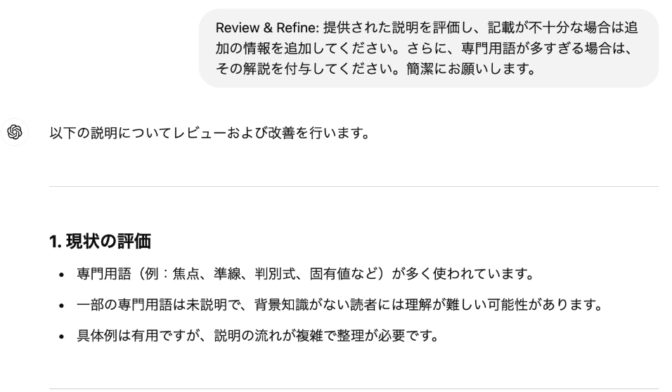- Review & Refine (評価・改善) :AIが出力した結果を評価しましょう。