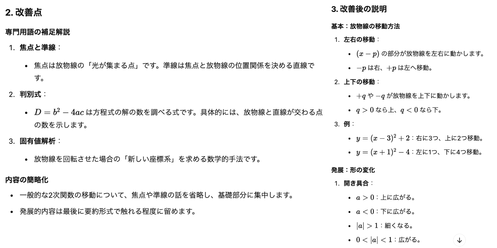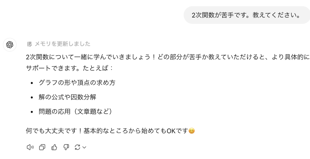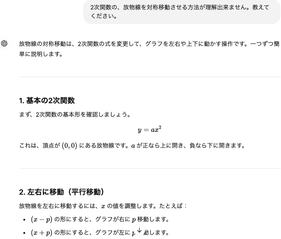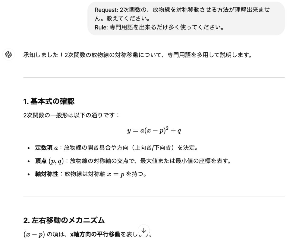 インターネットで検索をする感覚ではなく、数学の先生に質問をする感覚で質問をしましょう。下の画像が、正しくRequestをした例です。質問を具体的にするだけで、AIの回答内容が良くなります。