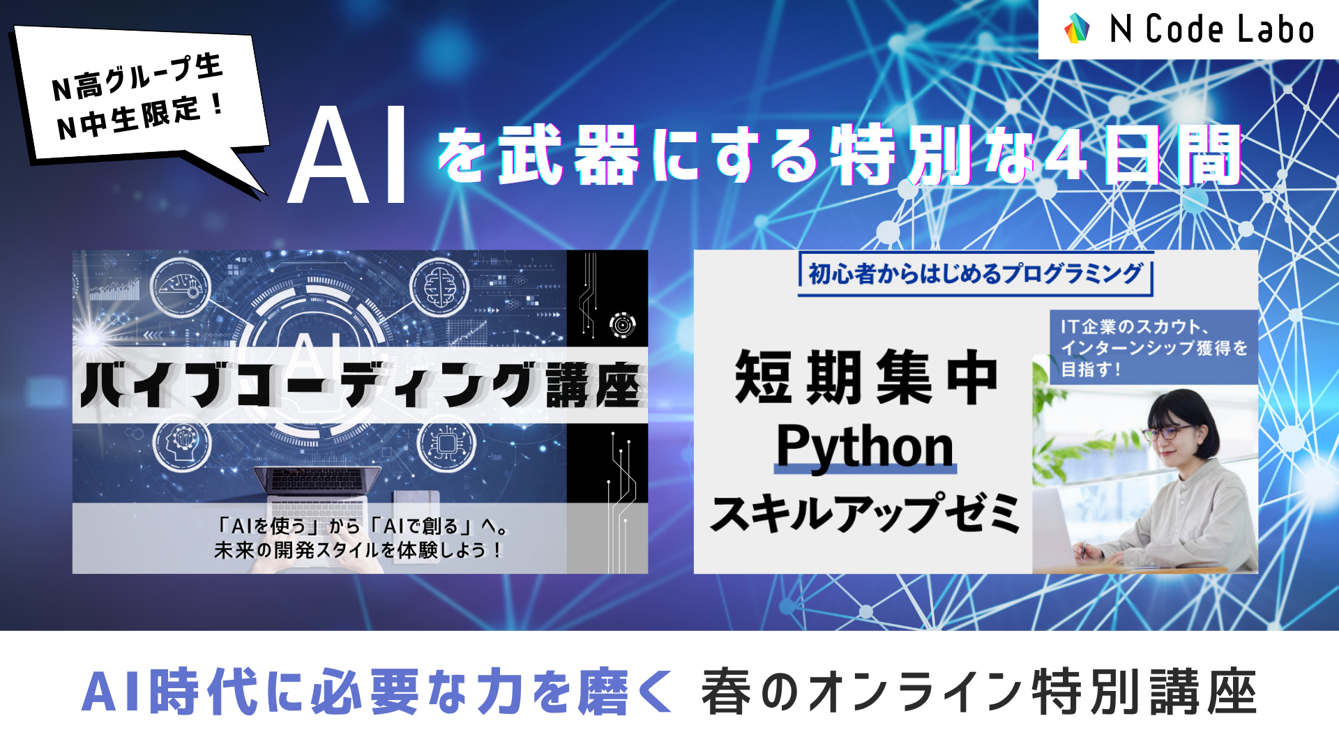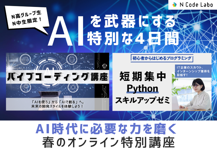 この春、N Code Laboでは、「AIを使いこなす力」と「企業が求めるプログラミング基礎力」を養成する春のオンライン特別講座(2講座)を開講いたします。